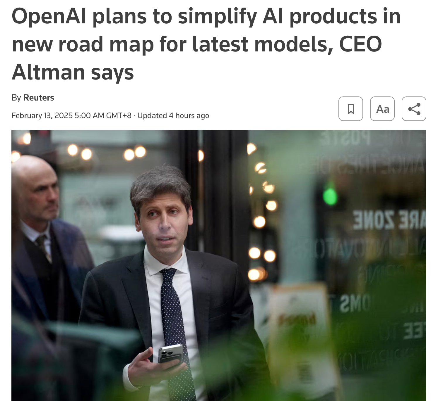 【環球網科技綜合報道】2月13日消息,據路透社報道,OpenAI首席執行官薩姆·奧爾特曼(Sam Altman)週三在社交媒體平台上發佈文章稱,OpenAI將不再推出“o3”作為獨立的人工智能模型。奧爾特曼表示,公司希望簡化產品供應,讓用户能夠更便捷地使用人工智能。