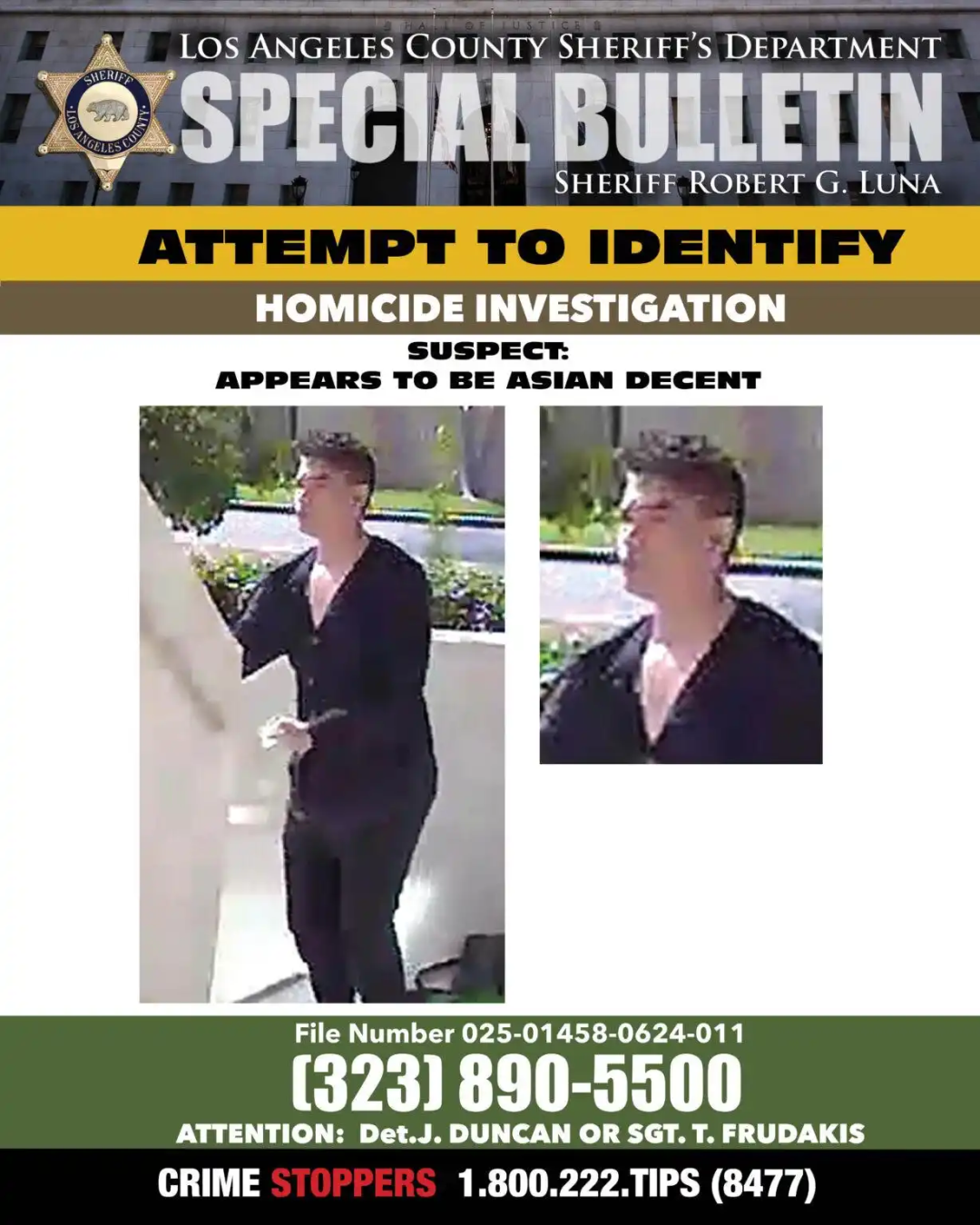 洛杉磯郡警局發佈的線索徵集令,圖為嫌疑人。網頁截圖