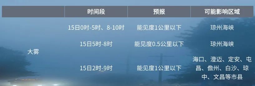 15日早晚時段,瓊州海峽和海南島東北半部有霧,對海峽通航和陸地交通有不利影響,請相關部門加強通航管理和交通疏導。