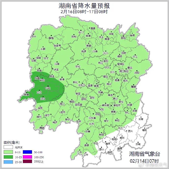 今天白天到晚上,衡陽、株洲、永州、郴州多雲轉小雨,其他地區陰天有小到中雨,其中懷化南部、邵陽西部、益陽南部、長沙西北部、岳陽南部局地有大雨;北風2~3級;最低氣温湘南6~8℃,其他地區4~6℃;最高氣温湘南13~15℃,其他地區8~10℃。