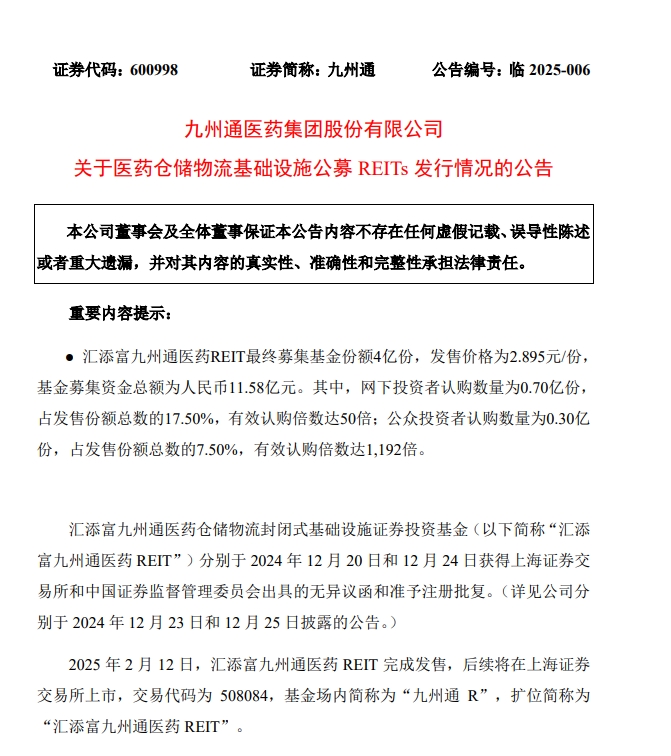 【環球網財經綜合報道】據九州通發佈公告稱,2 月 12 日,匯添富九州通醫藥 REIT 完成發售,後續將在上海證券交易所上市,交易代碼為 508084,基金場內簡稱為“九州通 R”,擴位簡稱為 “匯添富九州通醫藥 REIT”。