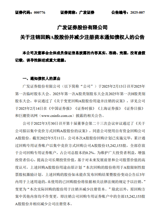 廣發證券變更回購A股用途,註銷1524萬股並減少註冊資本