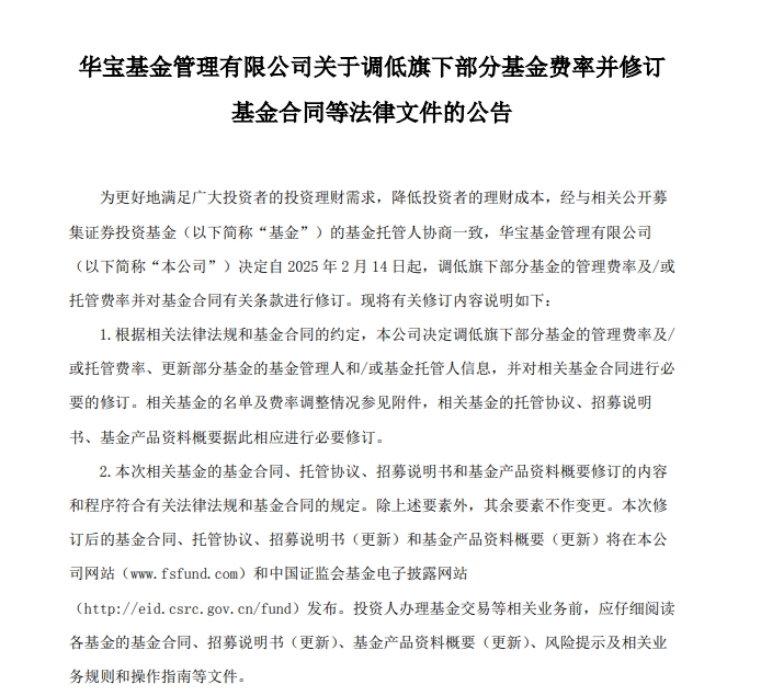無獨有偶,華寶基金宣佈,2 月 14 日起,調低華寶致遠混合(QDII)、華寶海外新能源汽車股票發起式(QDII)、華寶納斯達克精選股票發起式(QDII)、華寶標普美國消費美元(QDII-LOF) 、華寶海外中國混合 、華寶標普香港上市中國中小盤指數(LOF)管理費率及/或託管費率並對基金合同有關條款進行修訂。