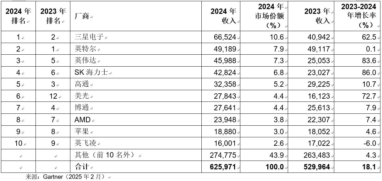 在存儲器設備價格強勁反彈的推動下,三星電子在2024年從英特爾手中奪回第一併擴大了領先優勢。2024年三星電子總收入為665億美元。由於AI PC和酷睿Ultra芯片組的優勢不足以抵消AI加速器產品和x86業務的緩慢增長,英特爾下降至第二。2024年英特爾的半導體收入增長了0.1%,與去年基本持平。英偉達2024年半導體總收入為460億美元,增長了84%。該公司憑藉其AI業務穩居第三位。(青雲)