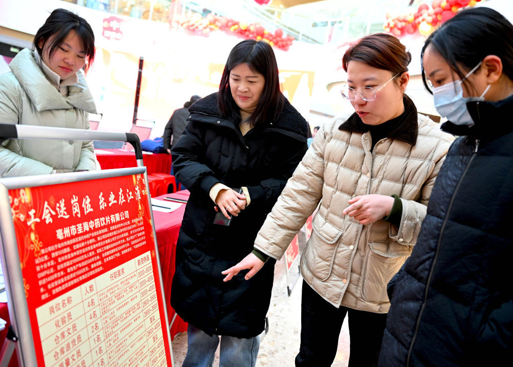 2月7日,求職者在安徽省亳州市譙城區舉辦的2025年“春風送崗就業援助專場招聘會”上了解招聘信息。新華社發(劉勤利 攝)