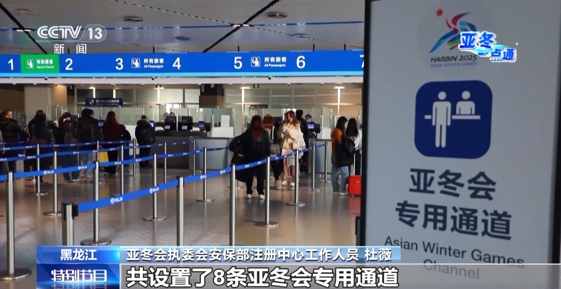 *亞冬會執委會安保部註冊中心工作人員 杜薇:*在口岸邊檢出入境大廳共設置了8條亞冬會專用通道,配備了多功能智能驗放設備,涉亞冬會人員可憑本人有效出入境證件和有效身份註冊卡,從專用通道快速通關。亞冬會身份註冊卡激活以後,涉亞冬會人員可以根據註冊卡上所標註的權限進入主媒體中心、競賽場館和運動員村等相應場所。