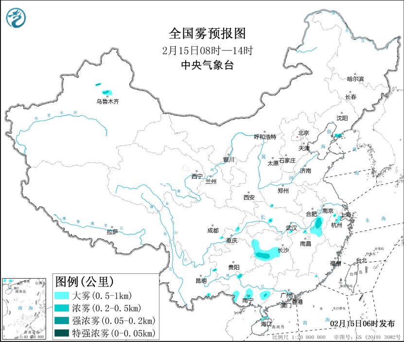 預計,2月15日早晨至上午,瓊州海峽將有能見度不足1公里的大霧。此外,安徽南部、江西北部、湖南中部、廣西南部、廣東雷州半島等地的部分地區有大霧,局地有能見度低於200米的強濃霧。因此,中央氣象台2月15日6時繼續發佈大霧黃色預警。