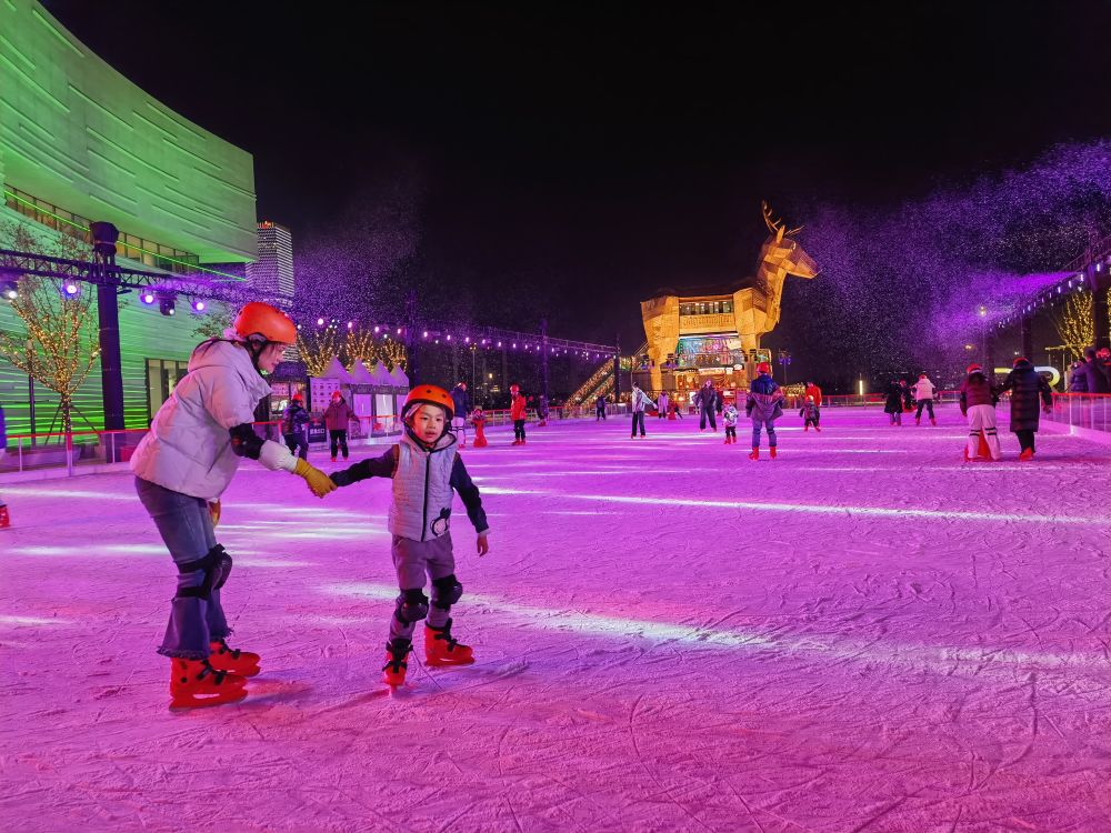 新華社上海2月14日電(記者陳愛平)在上海徐匯濱江,“樂滑之夢”和西岸夢中心聯手打造的户外水岸冰場熱鬧非凡。伴隨節奏感強的音樂和靈動燈光,上海市民周雄和兒子手牽手,在冰面上練習滑行。
