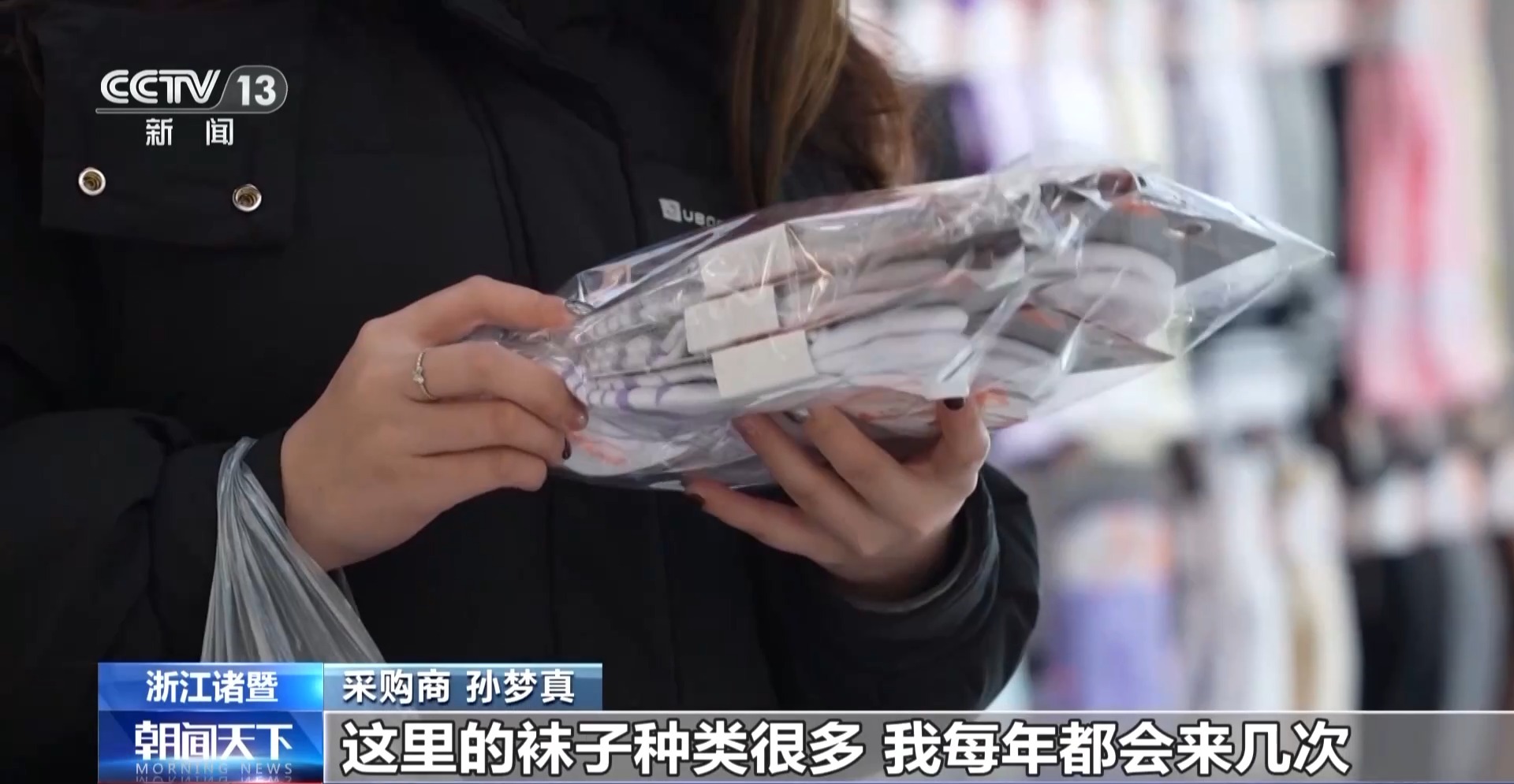 *採購商 孫夢真:*這裏的襪子種類很多,我每年都會來幾次。最近這裏有一些新產品,我要採購一些回去,很好賣的。