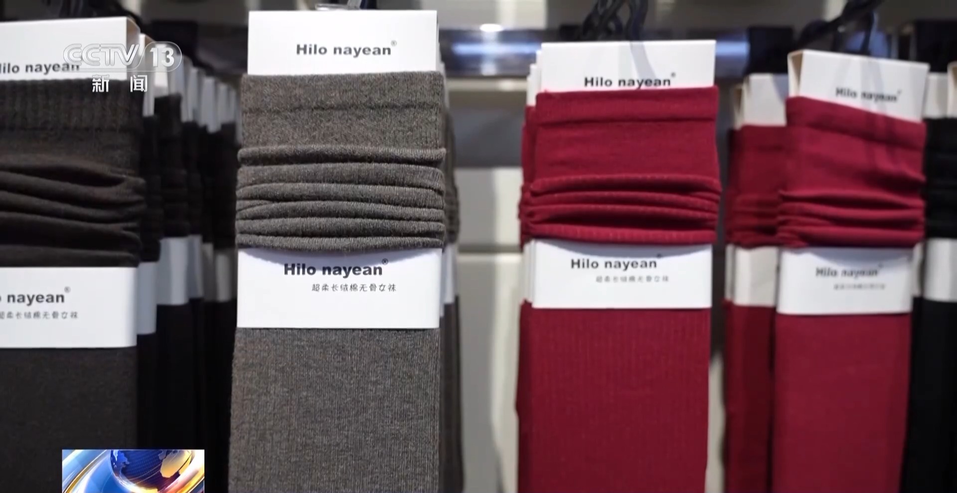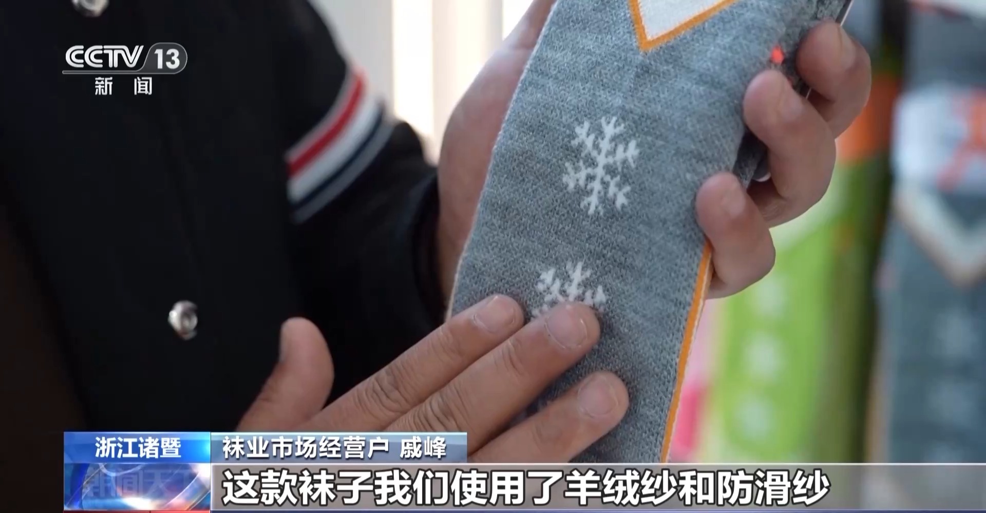 *襪業市場經營户 戚峯:*這款襪子我們使用了羊絨紗和防滑紗,在運動的時候既保暖又增加腳底摩擦力,是我們今年的最新款。