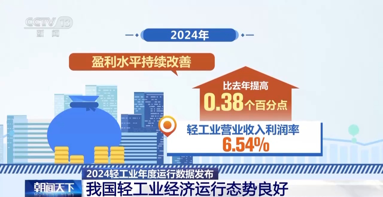 中國輕工業聯合會最新數據顯示,2024年,規模以上輕工企業實現營業收入23萬億元,同比增長2.0%。實現利潤1.5萬億元,同比增長8.3%。