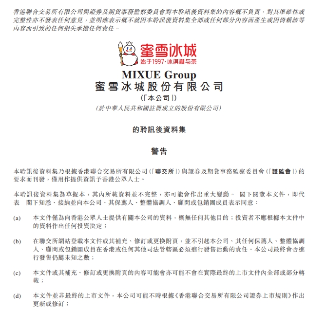 【環球網消費綜合報道】2月14日,蜜雪冰城股份有限公司(下稱“蜜雪冰城”)於港交所披露聆訊後資料集,這意味着蜜雪冰城通過了港交所聆訊。而就在2025年1月1日,蜜雪冰城時隔一年再次遞交了港股招股書。