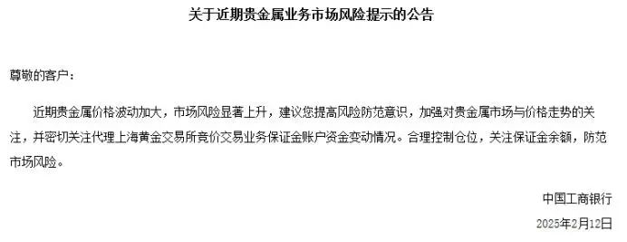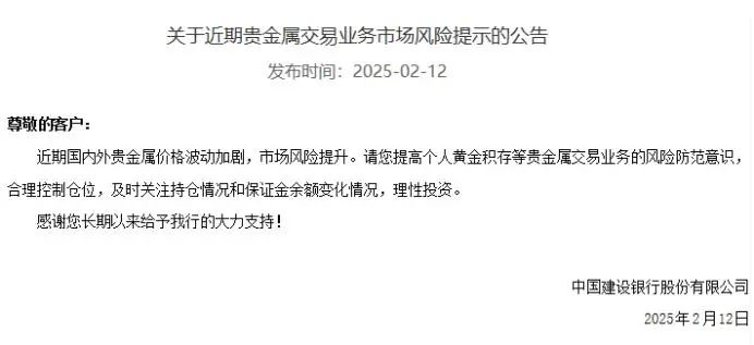2月12日,工商銀行、建設銀行同時發佈關於近期貴金屬市場業務風險提示的公告。兩大銀行在公告中指出,近期貴金屬價格波動加劇,市場風險顯著上升,提醒投資者一定要提高風險防範意識,加強對貴金屬市場與價格走勢的關注,合理控制倉位,防範市場風險,理性投資。