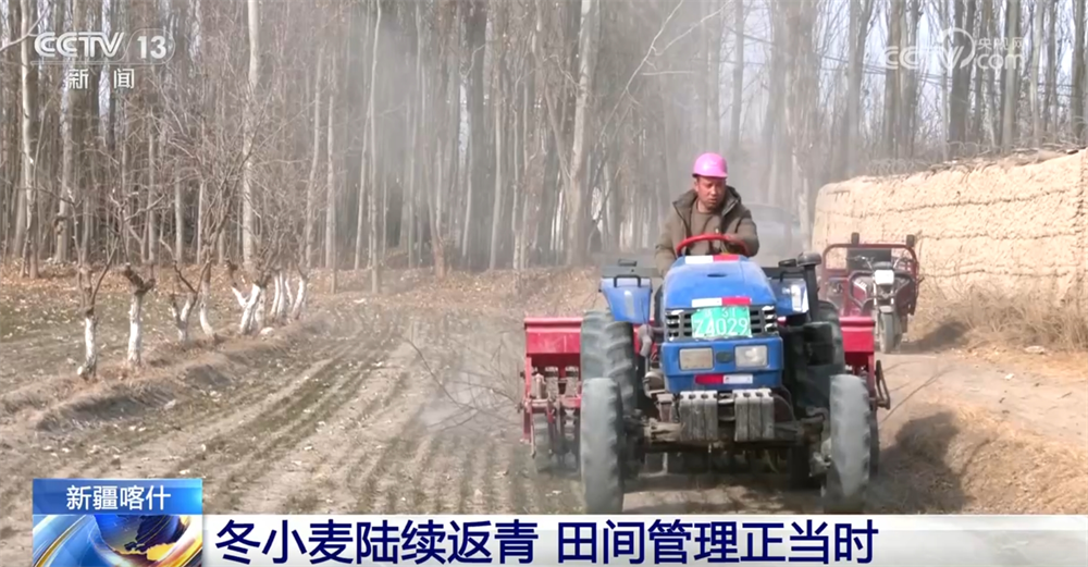 在新疆喀什阿依庫勒村,記者看到一袋袋肥料已碼放在地頭,拖拉機正在田間為冬小麥追施返青肥。為確保喀什地區冬小麥春季管理工作順利進行,當地農業部門結合當前冬小麥的長勢和天氣情況,科學指導,組織做好冬小麥病蟲草害防治、保墒防凍、追肥等工作。