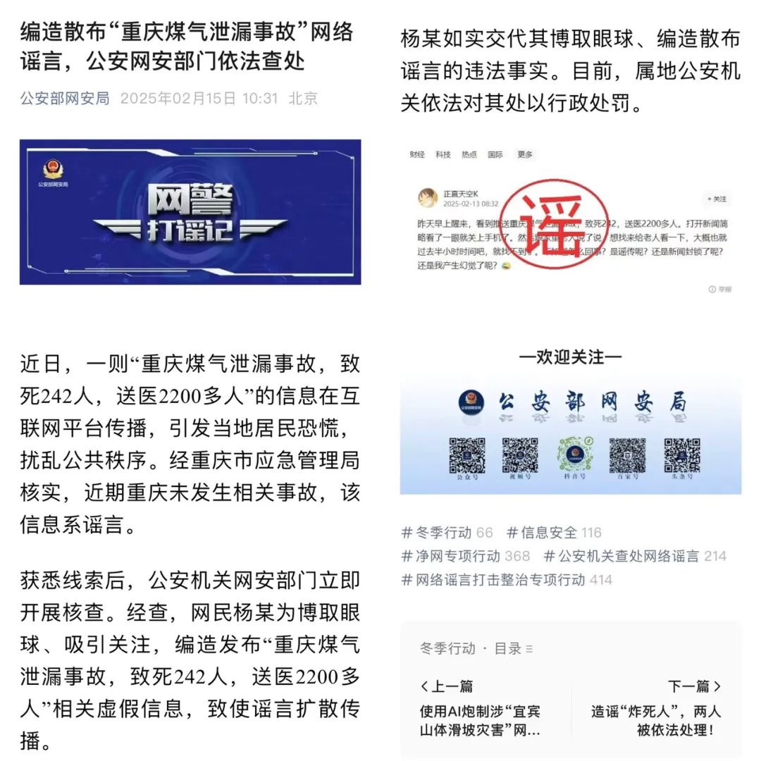 獲悉線索後,公安機關網安部門立即開展核查。經查,網民楊某為博取眼球、吸引關注,編造發佈“重慶煤氣泄漏事故,致死242人,送醫2200多人”相關虛假信息,致使謠言擴散傳播。