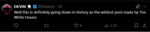 還有網友評論稱,“好吧,這是白宮發佈的最瘋狂的帖子,絕對會載入史冊。”