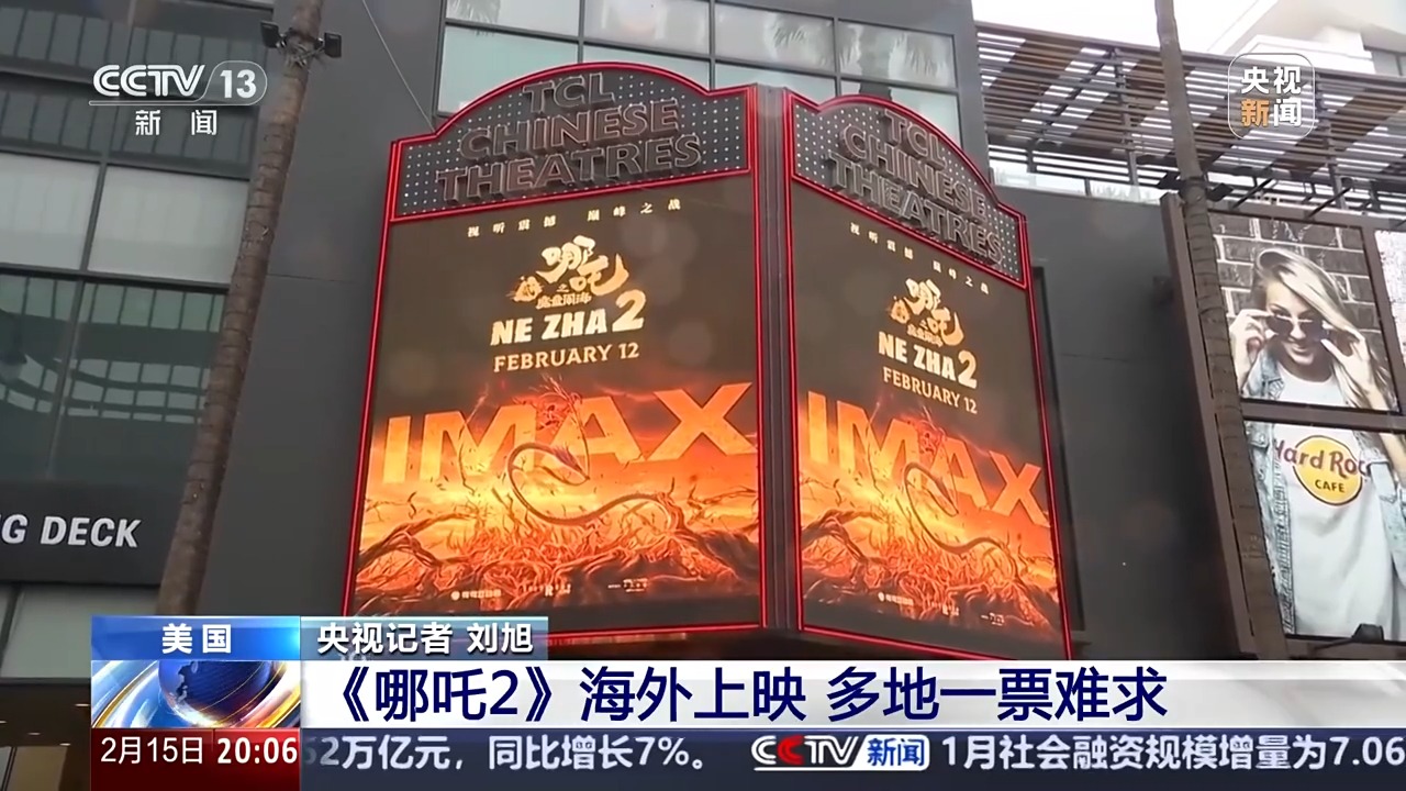*央視記者 劉旭:*這裏是紐約曼哈頓百老匯地區的一家地標性電影院,那麼在當地時間2月12日,《哪吒2》在北美上映的提前兩天,在這家影院的IMAX巨幕廳就已經開始提前點映《哪吒2》。通過手機App我們可以看到,《哪吒2》今天會一共上映四場,那麼晚上7點場的已經完全售罄,下午4點和晚上10點的場次也幾乎要售罄了。