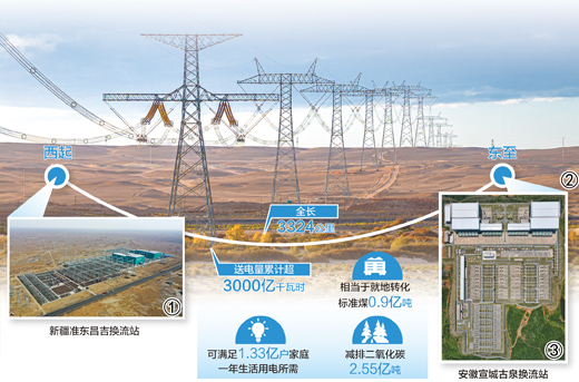 截至去年底,準東—皖南工程年度輸送電量達683.73億千瓦時,連續4年位居全國特高壓工程之首,佔安徽省2024年全社會用電量的19%,約等於該省69天的用電總量。
