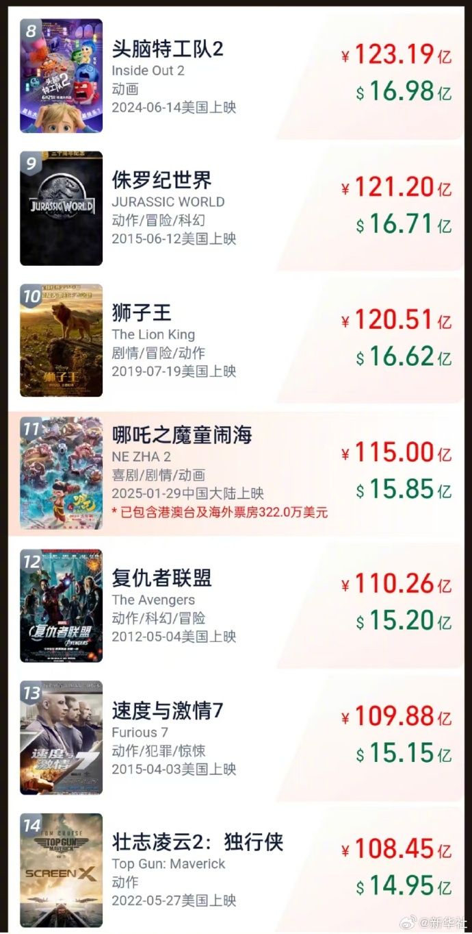 【環球網消費綜合報道】《哪吒之魔童鬧海》(簡稱《哪吒2》)在全球範圍內掀起觀影熱潮,累計票房(含預售及海外票房)已突破115億元人民幣。《哪吒2》成為中國電影史上首部票房過百億元、首部單一市場票房過10億美元、首部全球票房超10億美元的非好萊塢影片。《哪吒2》在全球動畫電影票房榜上位列前兩名,成為前三名中唯一的非好萊塢影片,展現了中國電影的強大實力。《哪吒2》有望進入全球電影票房前十。