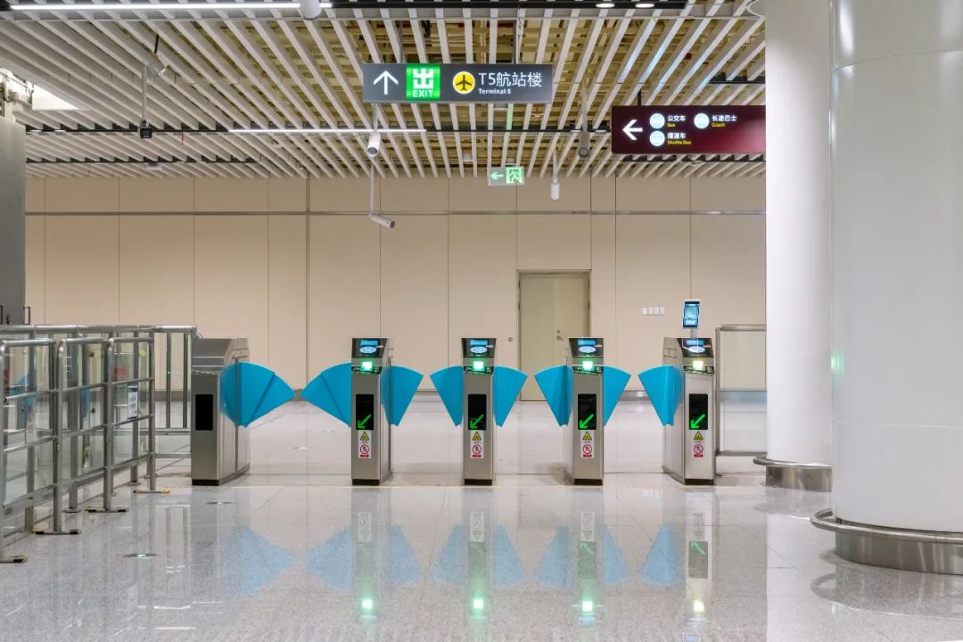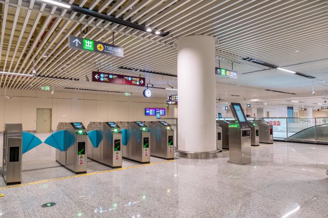 機場(T5)站進站支持單程票、本地及交通部一卡通、二維碼、人臉識別乘車,滿足乘客現金、二維碼支付、數字人民幣支付等多形式支付需求,特別是在機場(T5)站增設智能POS機設備,為持外卡刷卡乘客提供更加順暢的支付體驗;同時,出站閘機處增加乘客自助終端,能快速處理出站車票查詢、補票扣費等票務業務,進一步為乘客出站提供便利。