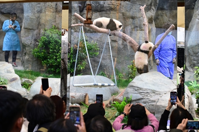 另據香港電台網站報道稱,在香港出生的大熊貓龍鳳胎“家姐”和“細佬”16日正式與公眾見面,第一批參觀人士於早上10時入場,“家姐”和“細佬”初次與市民見面,表現活躍,不時攀爬樹枝和鞦韆,兩隻大熊貓還碰頭玩耍,吸引市民不斷用手機拍攝或錄影。