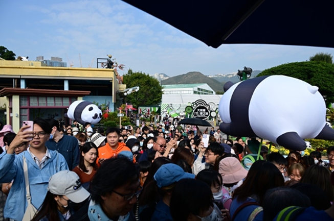 香港大熊貓龍鳳胎今日正式亮相,有市民提早3小時在公園外排隊