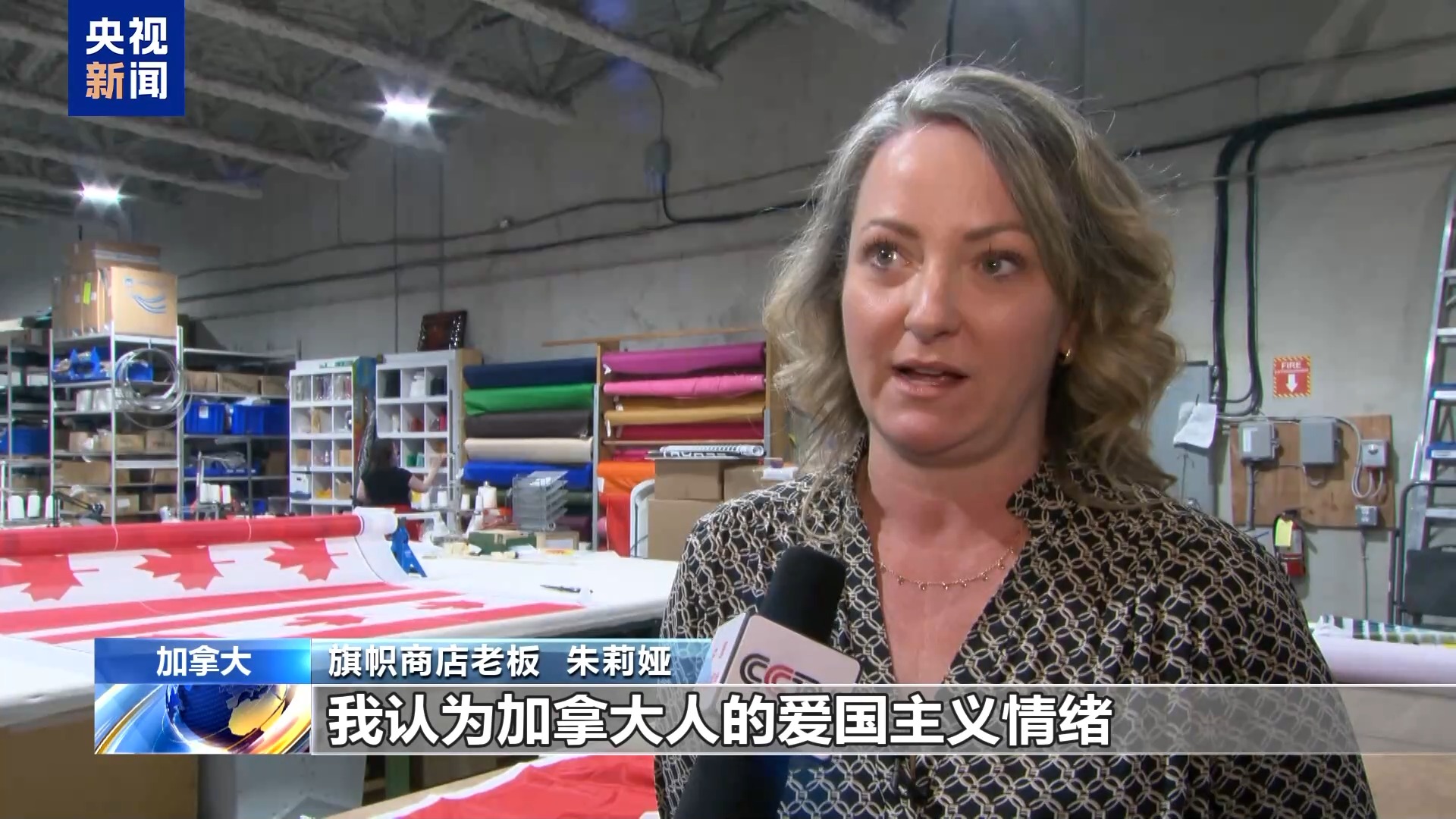 *旗幟商店老闆 朱莉婭:*今年是特殊的一年,世界上正在發生很多事情,我認為加拿大人的愛國主義情緒確實提升了。我們接到了很多想要買加拿大國旗的顧客打來的電話,我們看到需求大幅增加,預計今年這個時節的銷量可能增長四倍。