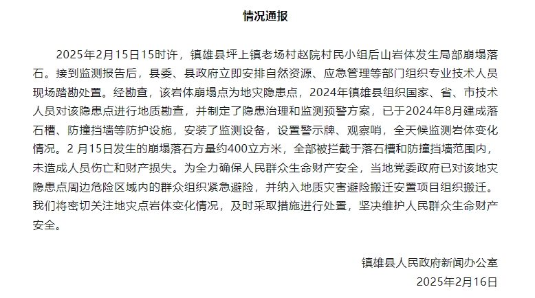 2025年2月15日15時許,鎮雄縣坪上鎮老場村趙院村民小組後山巖體發生局部崩塌落石。接到監測報告後,縣委、縣政府立即安排自然資源、應急管理等部門組織專業技術人員現場踏勘處置。經勘查,該巖體崩塌點為地災隱患點,2024年鎮雄縣組織國家、省、市技術人員對該隱患點進行地質勘查,並制定了隱患治理和監測預警方案,已於2024年8月建成落石槽、防撞擋牆等防護設施,安裝了監測設備,設置警示牌、觀察哨,全天候監測巖體變化情況。2 月15日發生的崩塌落石方量約400立方米,全部被攔截於落石槽和防撞擋牆範圍內,未造成人員傷亡和財產損失。為全力確保人民羣眾生命財產安全,當地黨委政府已對該地災隱患點周邊危險區域內的羣眾組織緊急避險,並納入地質災害避險搬遷安置項目組織搬遷。我們將密切關注地災點巖體變化情況,及時採取措施進行處置,堅決維護人民羣眾生命財產安全。