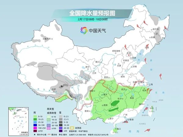 17日,黑龍江北部和東南部、吉林東部、新疆西部山區、西藏北部和東部、青海南部、川西高原東部等地部分地區有小雪或雨夾雪,其中,西藏東部等地部分地區有中雪,局地大雪。江漢、江南、西南地區東部、華南北部和西部、海南島東部等地部分地區有小雨,其中,湖南西部、廣西北部等地部分地區有中雨。