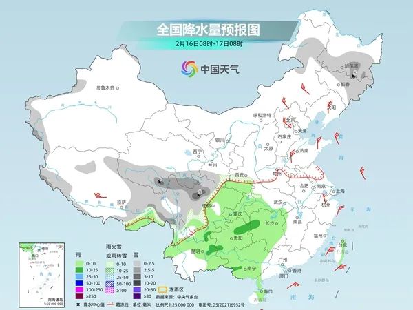 16日,內蒙古東北部、黑龍江中南部、吉林中東部、新疆西部山區、西藏東部、青海南部、川西高原等地部分地區有小雪或雨夾雪,其中,黑龍江南部、青海南部、川西高原北部等地部分地區有中雪,局地大雪。西南地區東部、江南西部、華南西部、海南島東部、台灣島東部等地部分地區有小雨,其中,湖南西部、貴州東部和西南部、雲南東部、廣西西南部等地部分地區有中雨。
