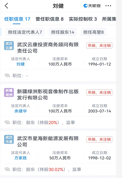 另據公開資料顯示,劉健此前擔任法人代表或監事的多家公司均被吊銷營業執照,直到目前也未進行註銷,包括“武漢雲康投資商務顧問有限責任公司”“新疆綠洲影視印象製作出版發行有限公司”“武漢市星海新能源發展有限公司”等等,其中“武漢雲康投資商務顧問有限責任公司”是最高人民法院公示的失信人,導致其法人代表劉健也被法院下發了限制消費令,失信行為為“有履行能力而拒不履行生效法律文書確定義務”,涉及金額高達300萬元以上。