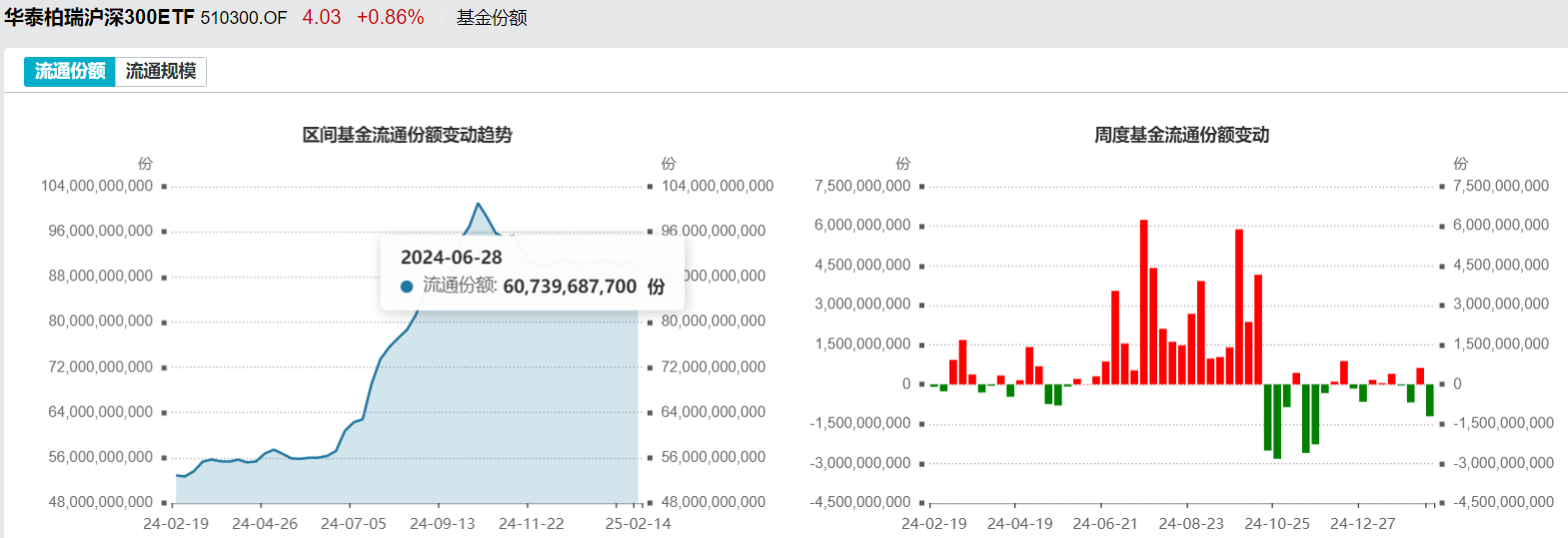 另據Wind數據統計,自2024年10月13日之後至上週五,滬深300ETF(510300.OF)份額趨勢性減少的,從1011億份減少到了896億份,創業板ETF(159915.OF)則從550億份減少到420億份。