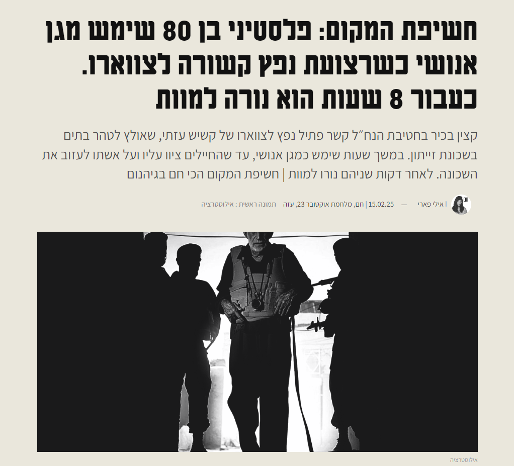 據多名參戰士兵證實,2024年5月以軍第99師等部隊在加沙執行清剿任務時,在某民宅發現一對年過八旬的夫婦因為行動不便尚未撤離。以軍指揮官隨即下令用二人充當“肉盾”。