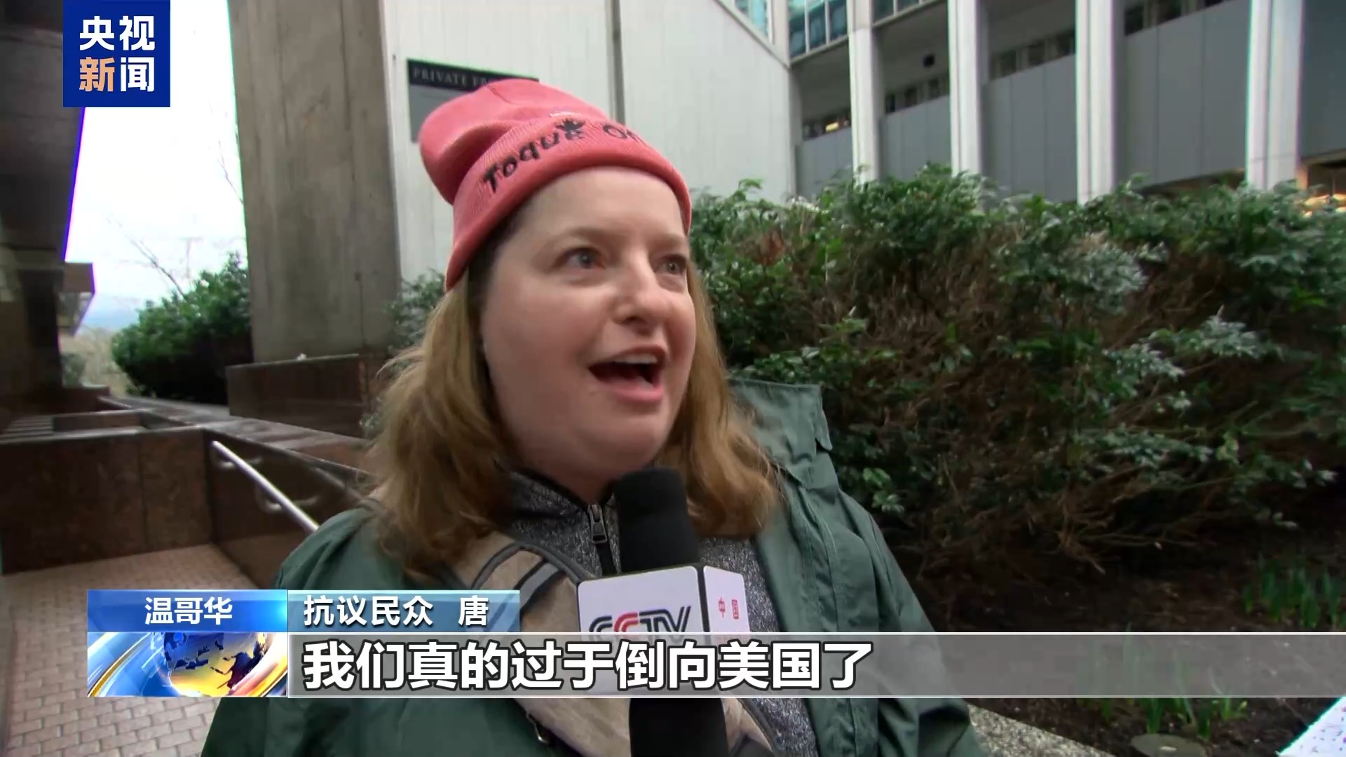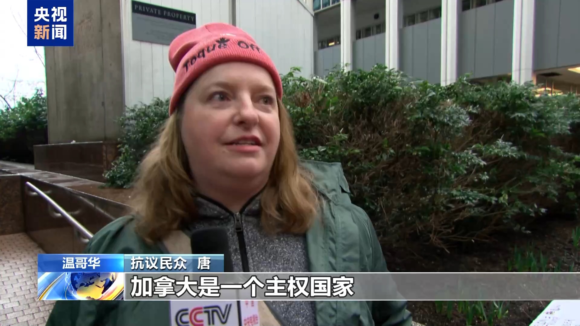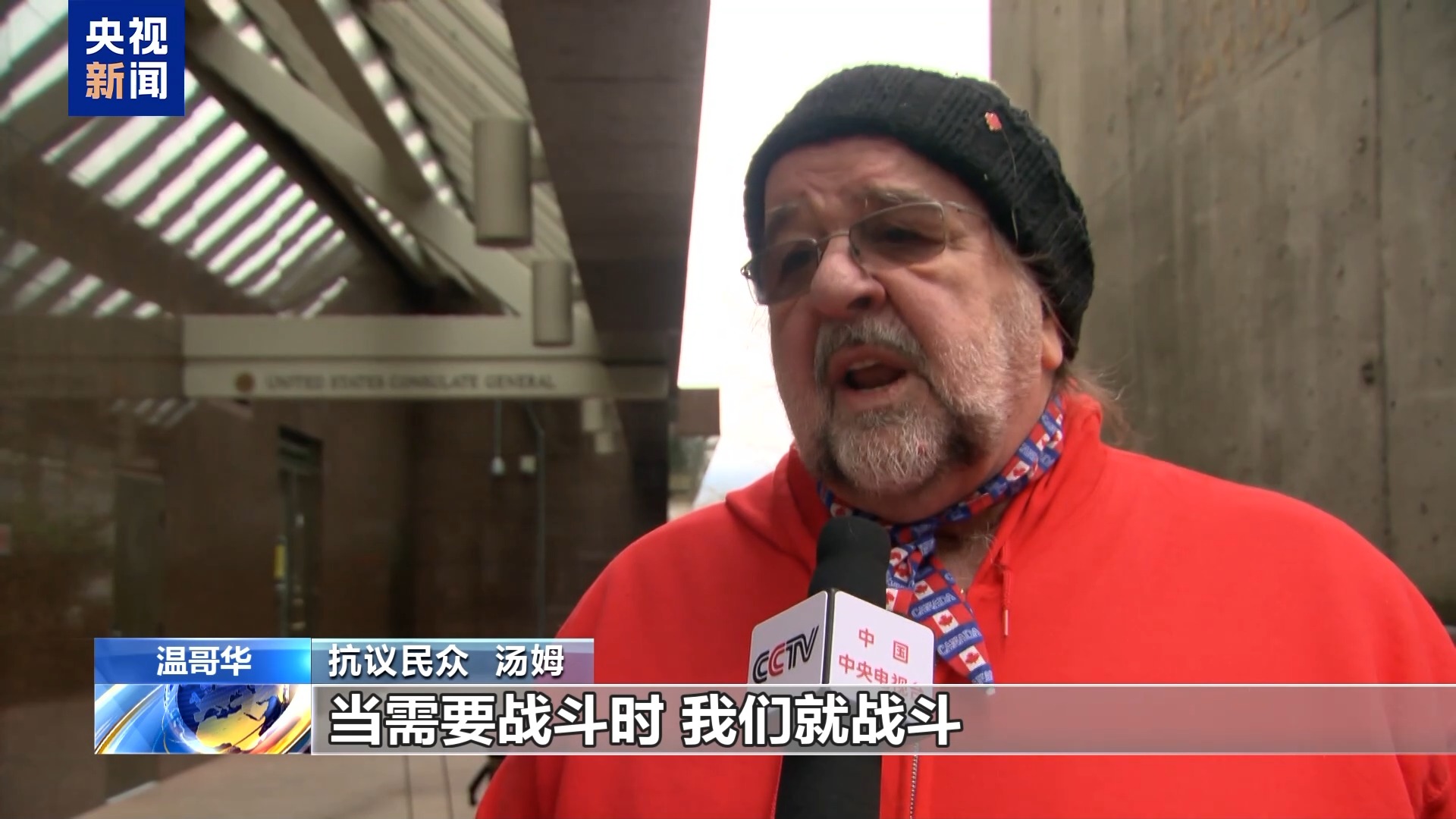 當天,大批抗議民眾在美國駐温哥華總領館門前揮舞着加拿大國旗,歌唱加拿大國歌,打出“加拿大不是美國第51州”“加拿大是非賣品”“關税不會讓雞蛋降價”等標語,回應美國近期持續的政治和經濟威脅,呼籲加拿大民眾團結起來捍衞國家主權和尊嚴。