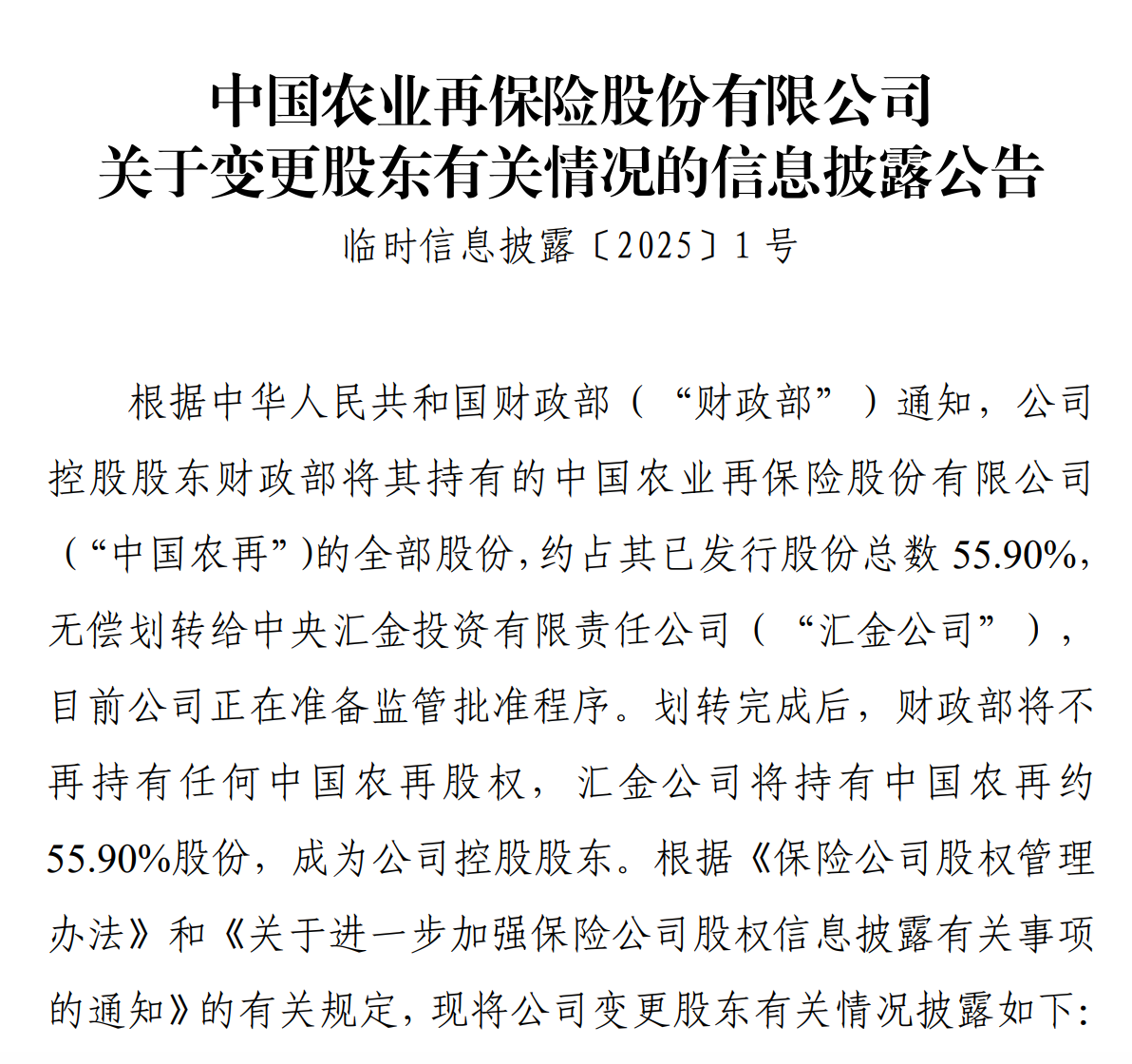 根據公告,劃轉完成後,財政部將不再持有任何中國農再股權,匯金公司將持有中國農再約55.90%股份,成為公司控股股東。公告顯示,此次股東變更系通過國有股權的無償劃轉進行,不涉及資金支付。
