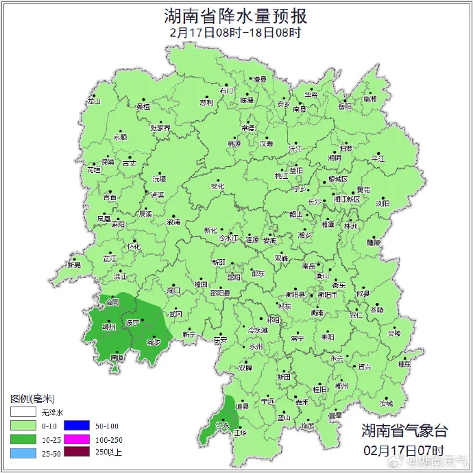 湖南省氣象台預計,17日至19日,省內多陰雨天氣,湘中以北降水加大,局地大雨;20日至23日,湘中部分地區有中到大雨,其中22日至23日白天,湘西北高海拔地區,有雨夾雪或小雪,局地有*凍雨。*具體來看: