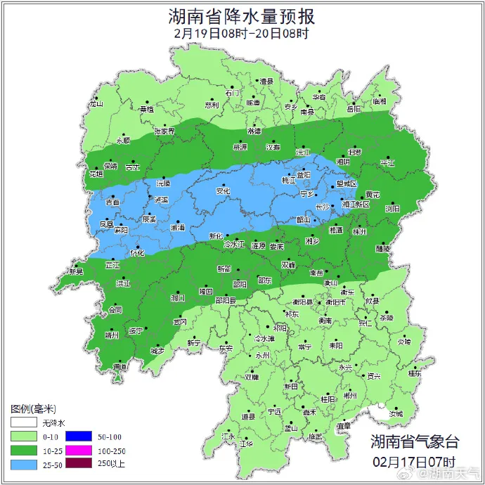 19日白天到晚上,湘中以北陰天有小到中雨,其中湘西州南部、懷化中部、益陽中南部、婁底北部、長沙西部、岳陽西南部和湘潭北部局地大雨,其他地區陰天有小雨;北風2級至3級;最低氣温湘中以北4℃至6℃,其他地區6℃至8℃;最高氣温湘南11℃至13℃,其他地區8℃至10℃。