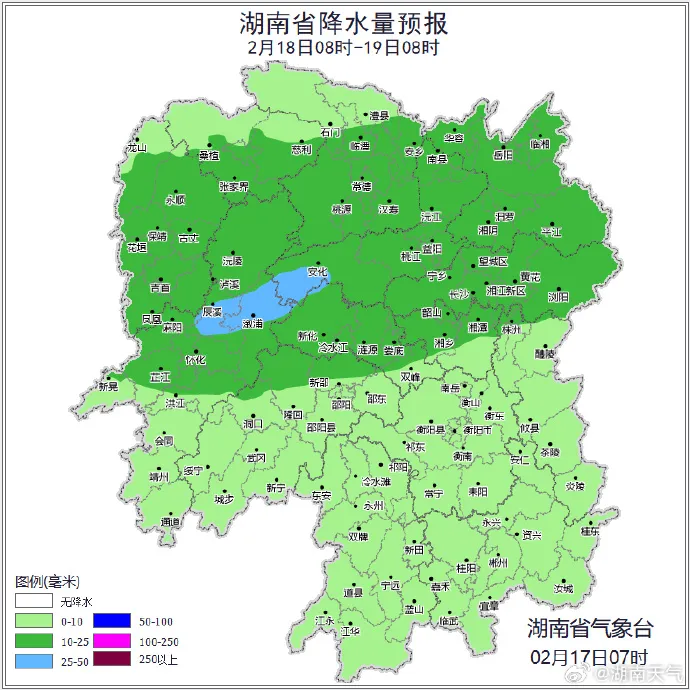 18日白天到晚上,湘中以北陰天有小到中雨,其中益陽西部、懷化中部局地大雨,其他地區陰天有小雨;北風2級至3級;最低氣温湘中以北4℃至6℃,其他地區6℃至8℃;最高氣温湘北、湘南11℃至13℃,其他地區8℃至10℃。