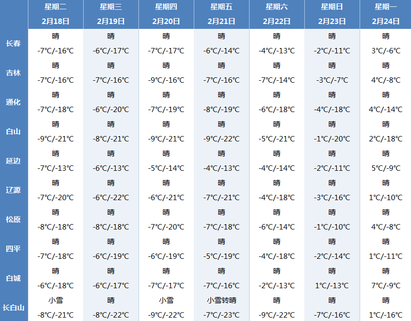長春市今天夜間最低氣温:-16℃,明天白天最高氣温:-7℃。