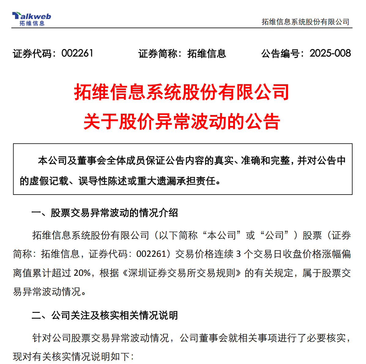 【環球網財經綜合報道】2月17日消息,拓維信息發佈股價異常波動公告,該公司股票交易價格連續3個交易日收盤價格漲幅偏離值累計超過20%。公告説明相關情況,並表示將於2025年4月25日披露2024年年度報告,目前仍在報告編制期間,具體財務數據請以公司披露的2024年年度報告為準。