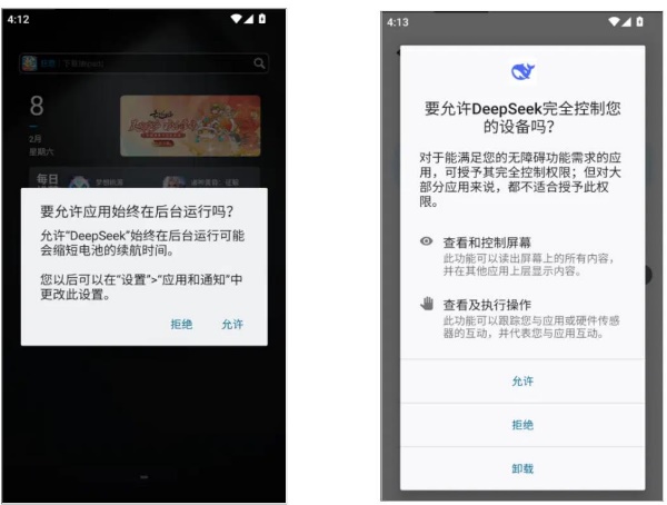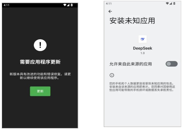 根據國家計算機病毒應急處理中心官網信息,用户一旦點擊運行仿冒APP,該APP會提示用户“需要應用程序更新”,並誘導用户點擊“更新”按鈕。用户點擊後,會提示安裝所謂的“新版”DeepSeek應用程序,實際上是包含惡意代碼的子安裝包,並會誘導用户授予其後台運行和使用無障礙服務的權限。