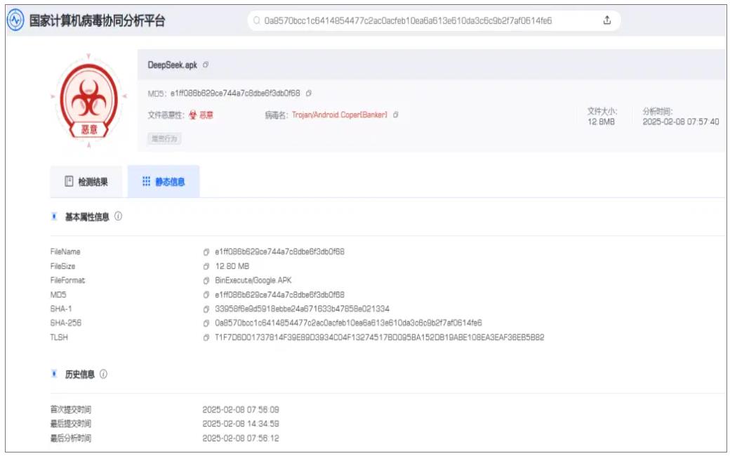 國家計算機病毒應急處理中心捕獲仿冒DeepSeek手機木馬病毒