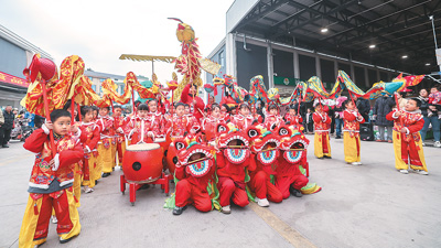 2月12日,在位於浙江杭州建德市更樓街道的建德新農都農產品批發市場內,一場特色元宵市集主題活動助力消費市場升温。2025年1月正式投入使用的建德新農都農產品批發市場建築面積8.29萬平方米,集蔬菜、水果、肉類、水產品等批發零售於一體,發揮保障商品供應和穩定區域物價作用。圖為元宵市集上,小朋友表演“萌娃舞龍”。