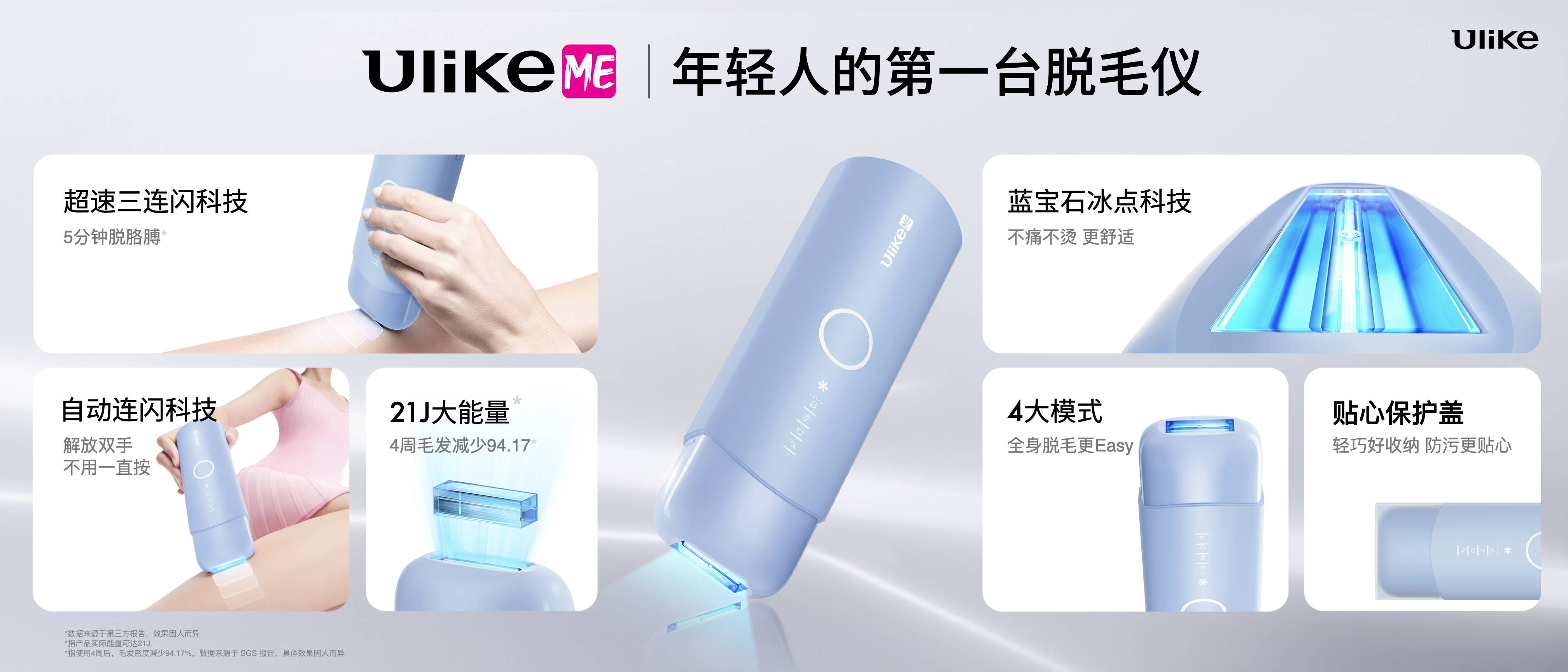 發佈會還發布了適合年輕人和大學生使用的“2025全新系列脱毛儀Ulike ME”,擁有21J大能量,能讓毛髮脱得更乾淨;1秒3閃的超快速度,能讓脱毛更高效;自動連閃科技,解放雙手,能讓脱毛更輕鬆;同樣的真藍寶石冰點科技,不痛不燙,能讓脱毛更舒適。