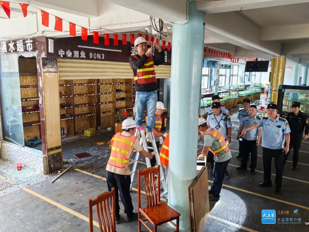 當天上午,在施工人員作業前,相關部門工作人員協助春園海鮮廣場內的經營商户和人員進行有序撤離,完成物品搬離、設備移除等工作。在確認建築物完全騰空並落實斷水斷電措施後,為當天下午的正式拆除工作排除安全隱患。由於春園海鮮廣場位於臨街位置,周邊為居民區,為不影響旁邊的房屋安全,現場設置施工圍蔽措施,並配備灑水車同步灑水壓塵以減輕對周邊環境的影響。