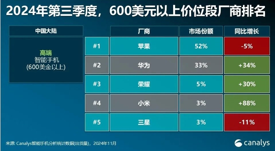 據榮耀公佈的數據顯示,2024年,榮耀全年海外市場年度增幅達50%,12月海外銷量佔比首次超過50%,聖誕期間單日銷量突破15萬台。而根據Canalys報告,2024年第三季度,榮耀躋身全球600美元以上高端市場前五。