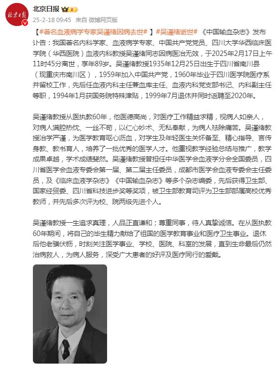 《中國輸血雜誌》發佈訃告:我國著名內科學家、血液病學專家、中國共產黨黨員、四川大學華西臨牀醫學院(華西醫院)血液內科教授吳謹緒同志因病醫治無效,於2025年2月17日上午11時45分離世,享年89歲。吳謹緒教授1935年12月25日出生於四川省南川縣(現重慶市南川區),1959年加入中國共產黨,1960年畢業於四川醫學院醫療系並留校工作,先後任血液內科主任兼血庫主任、血液內科黨支部書記、內科副主任等職,1994年1月獲國務院特殊津貼,1999年7月退休並同時返聘至2020年。