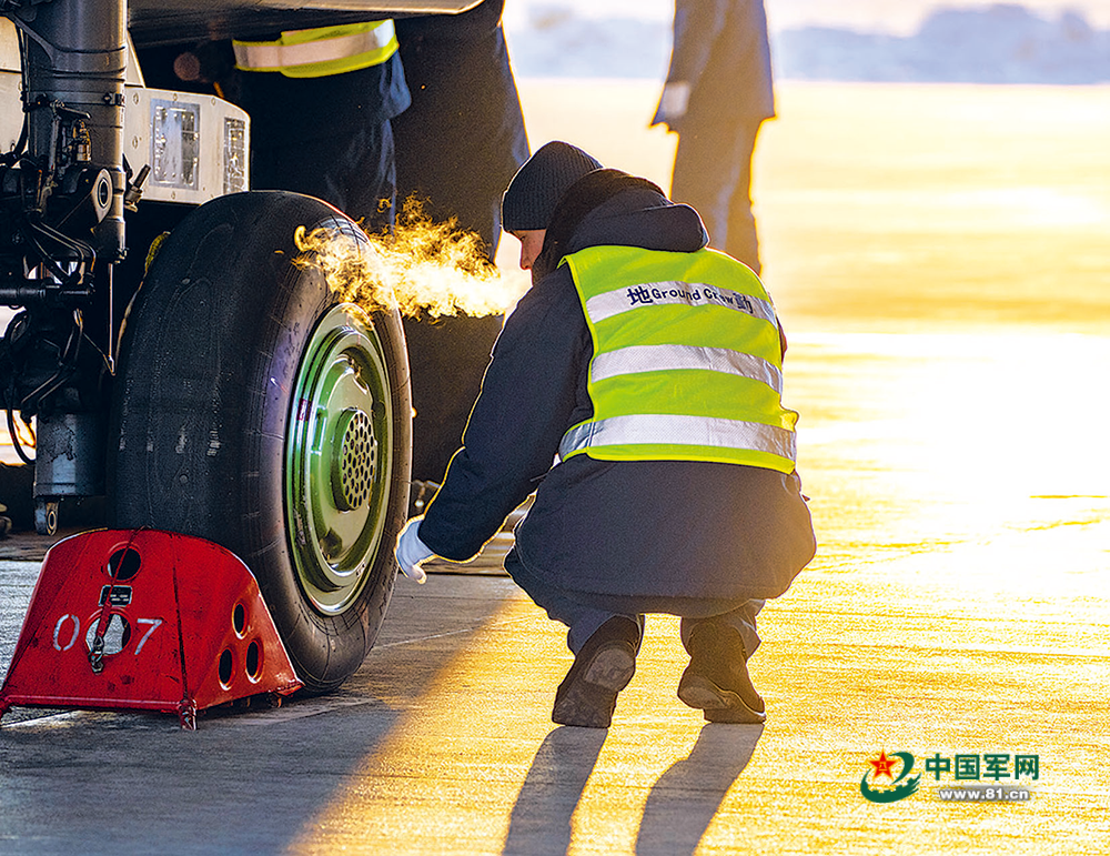 停機坪上,戰機蓄勢待發。機務人員冒着嚴寒,一絲不苟對戰機進行起飛前的檢查維護。完成繞機檢查後,飛行員們迅速登機,全神貫注進行起飛前準備工作。