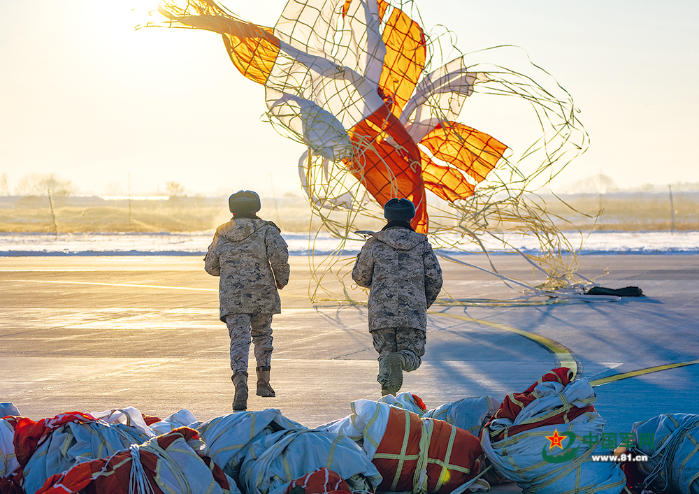 訓練結束,戰機返航。跑道上,戰機穩穩降落。“嘭”的一聲,阻力傘脱落,保傘員頂着凜冽寒風快速前去撿傘……