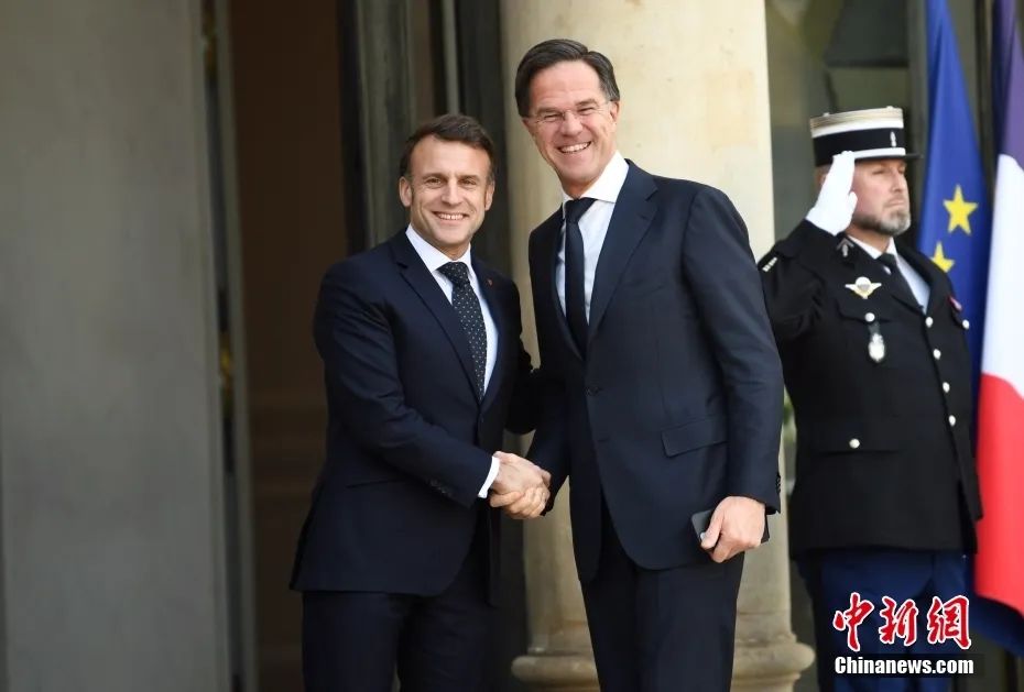 當地時間2月17日,歐洲主要國家領導人在巴黎會晤,商討地區安全局勢。圖為法國總統馬克龍在巴黎愛麗捨宮與北約秘書長呂特會面。中新社記者 李洋 攝